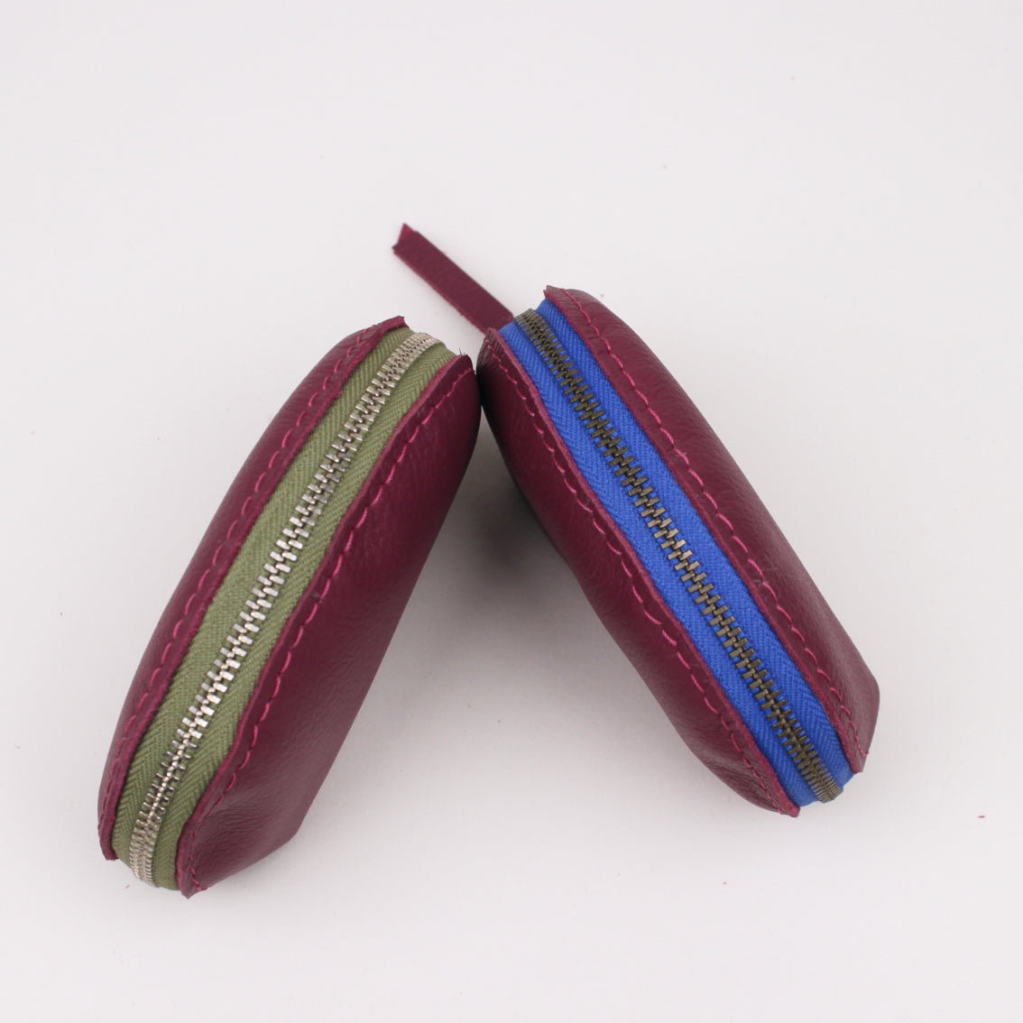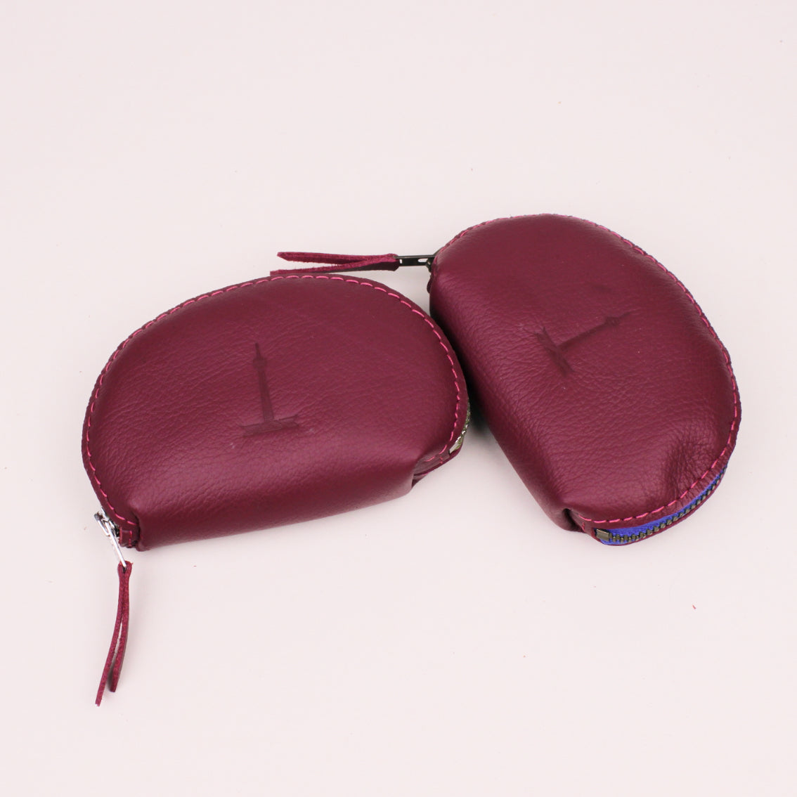 Kleines Etui aus upcycling Leder aus der Bestuhlung des Fernsehturms mit einem farbigen Reißverschluss und einem kleinen Fernsehturmstempel.