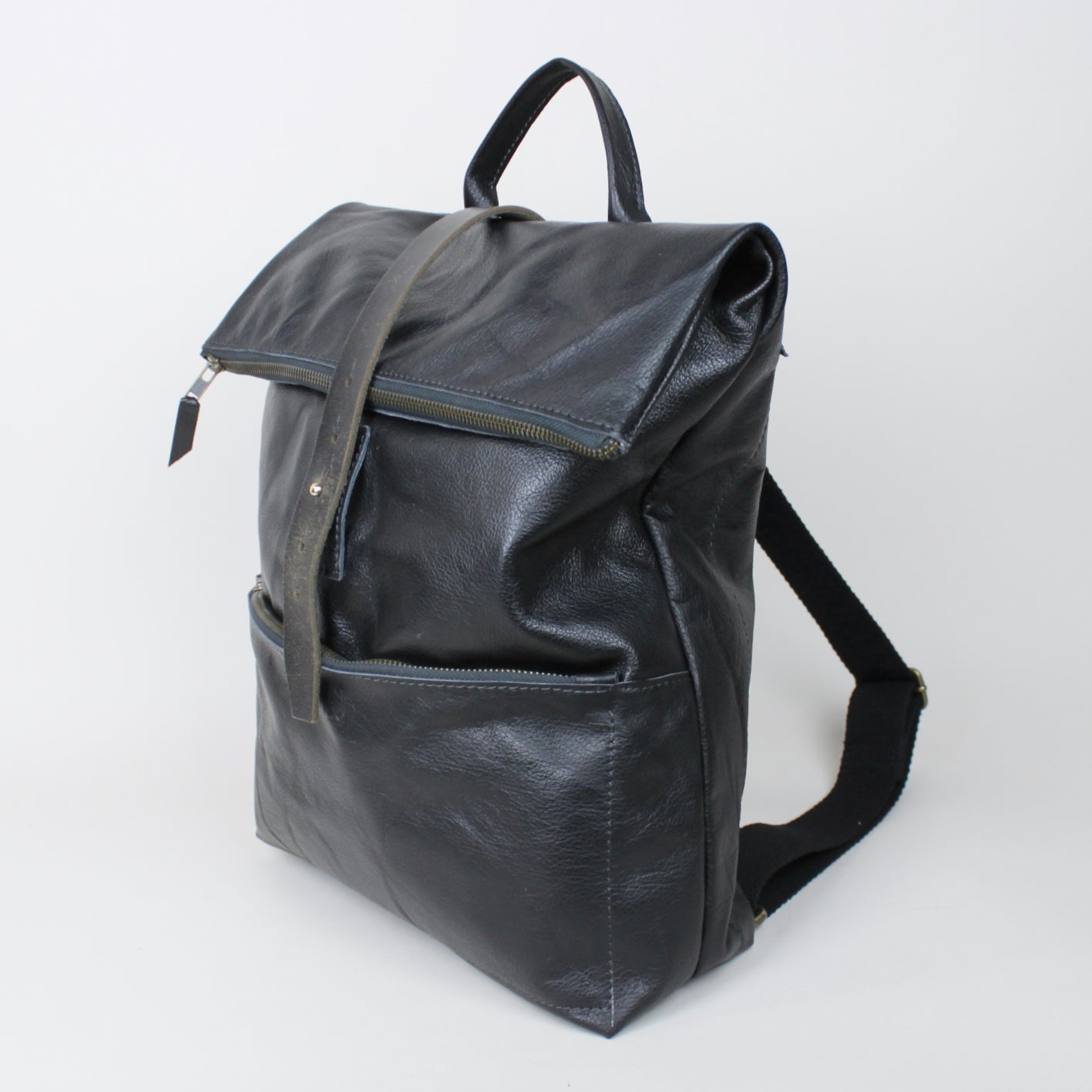 Gefütterter großer Rucksack aus upgecyceltem Leder mit einem Innenfach, einem Aussenfach und einem großen Fach am Rücken je mit Reißverschluss.