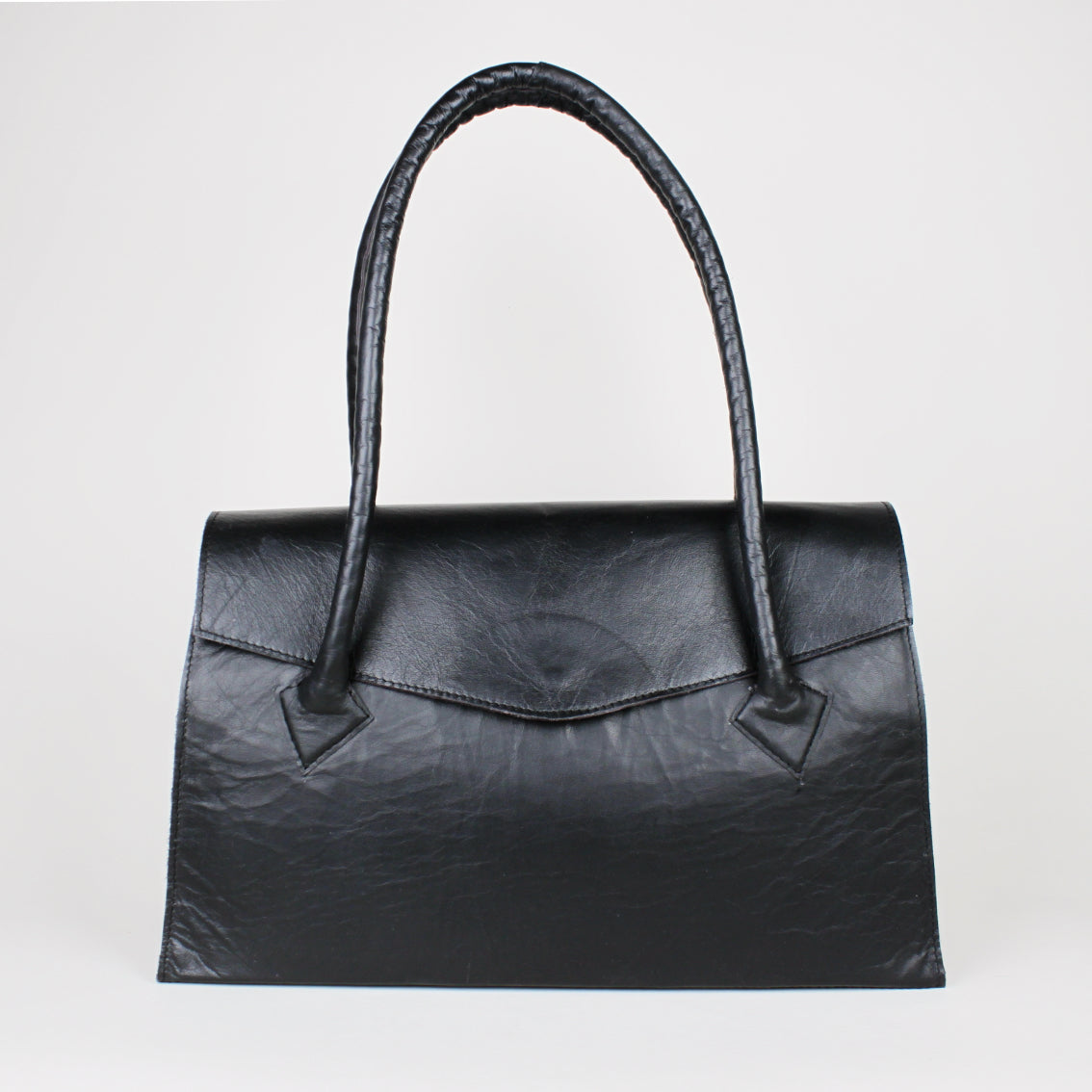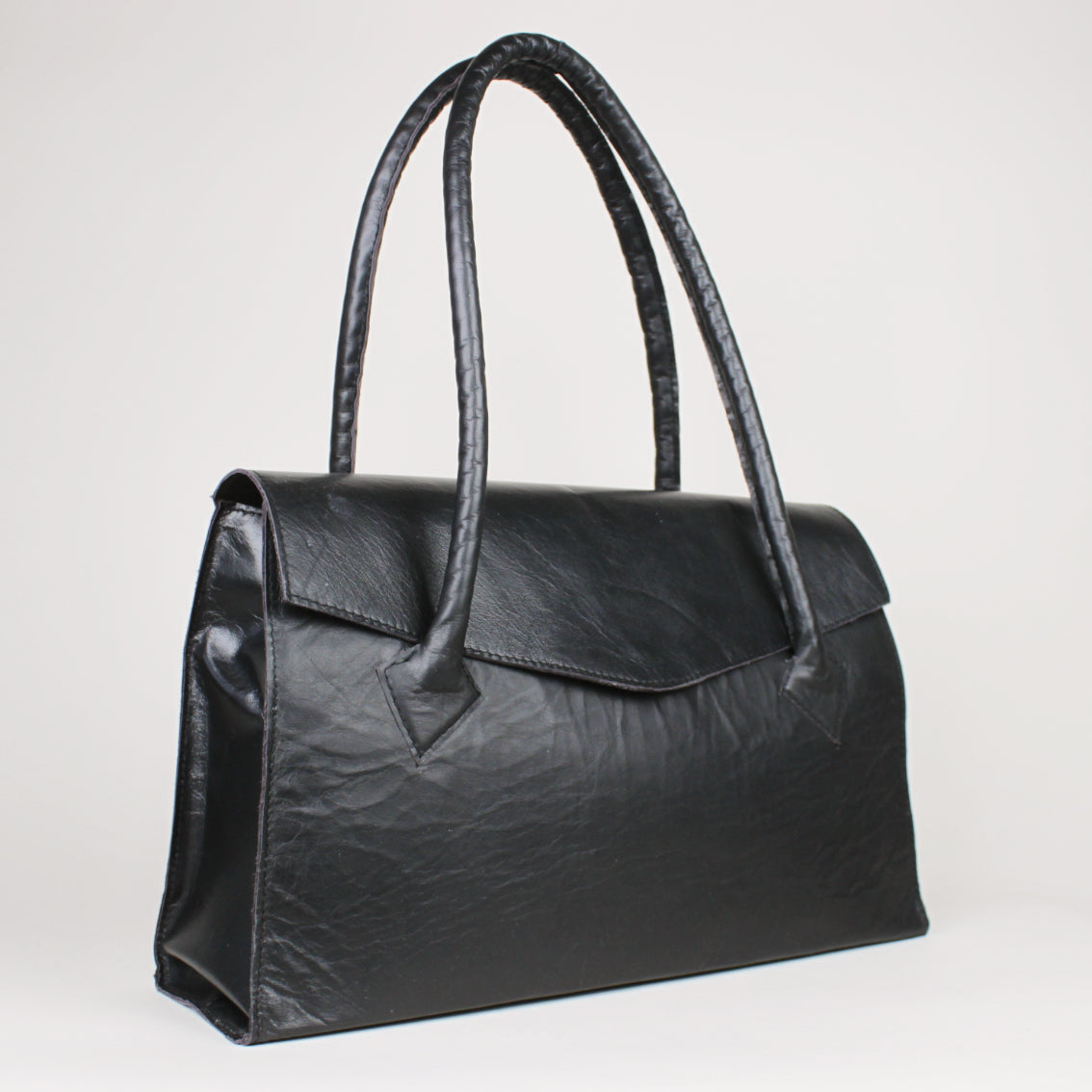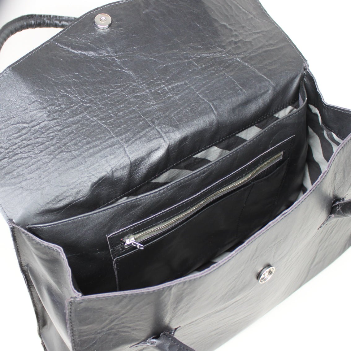 Elegante und gleichzeitig übersichtliche Handtasche im Querformat aus upcycling Leder. Sie ist mit Baumwollstoff gefüttert und besitzt neben einem Laptopfach ein Reißverschlussfach und Steckfächer.