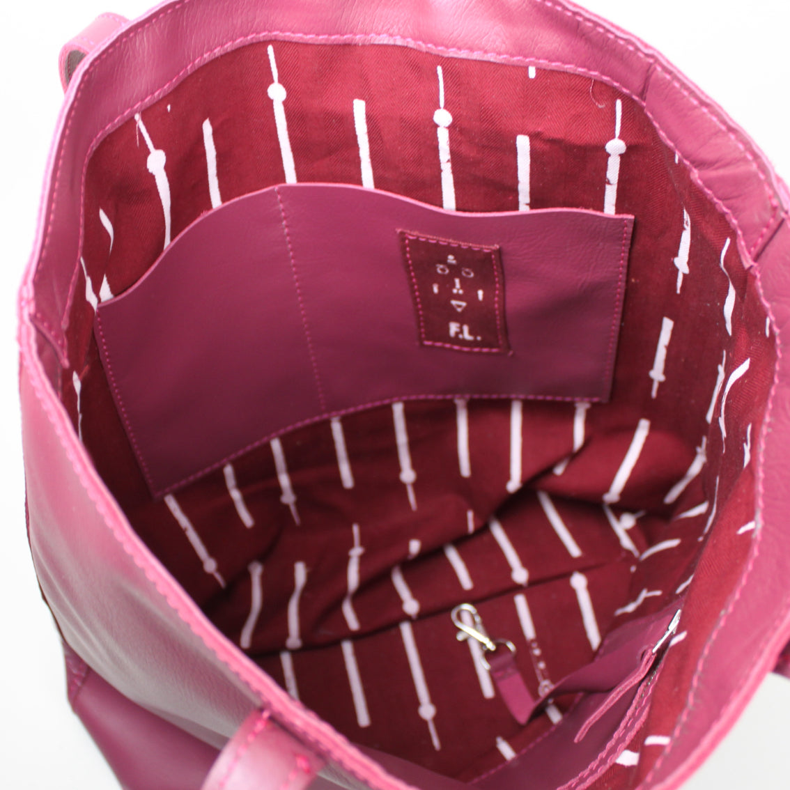Die Tasche hat zwei Innentaschen und ein Schlüsselband.