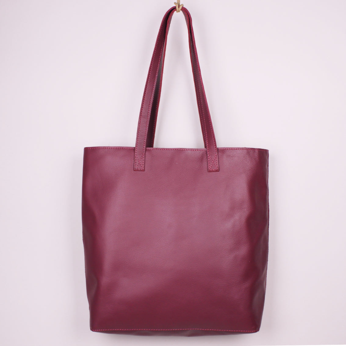 Große Handtasche, genäht aus dem upgecycelten Leder der Bestuhlung des Fernsehturms, gefüttert mit handgedrucktem und gefärbtem Stoff von Franziska Lutze.
