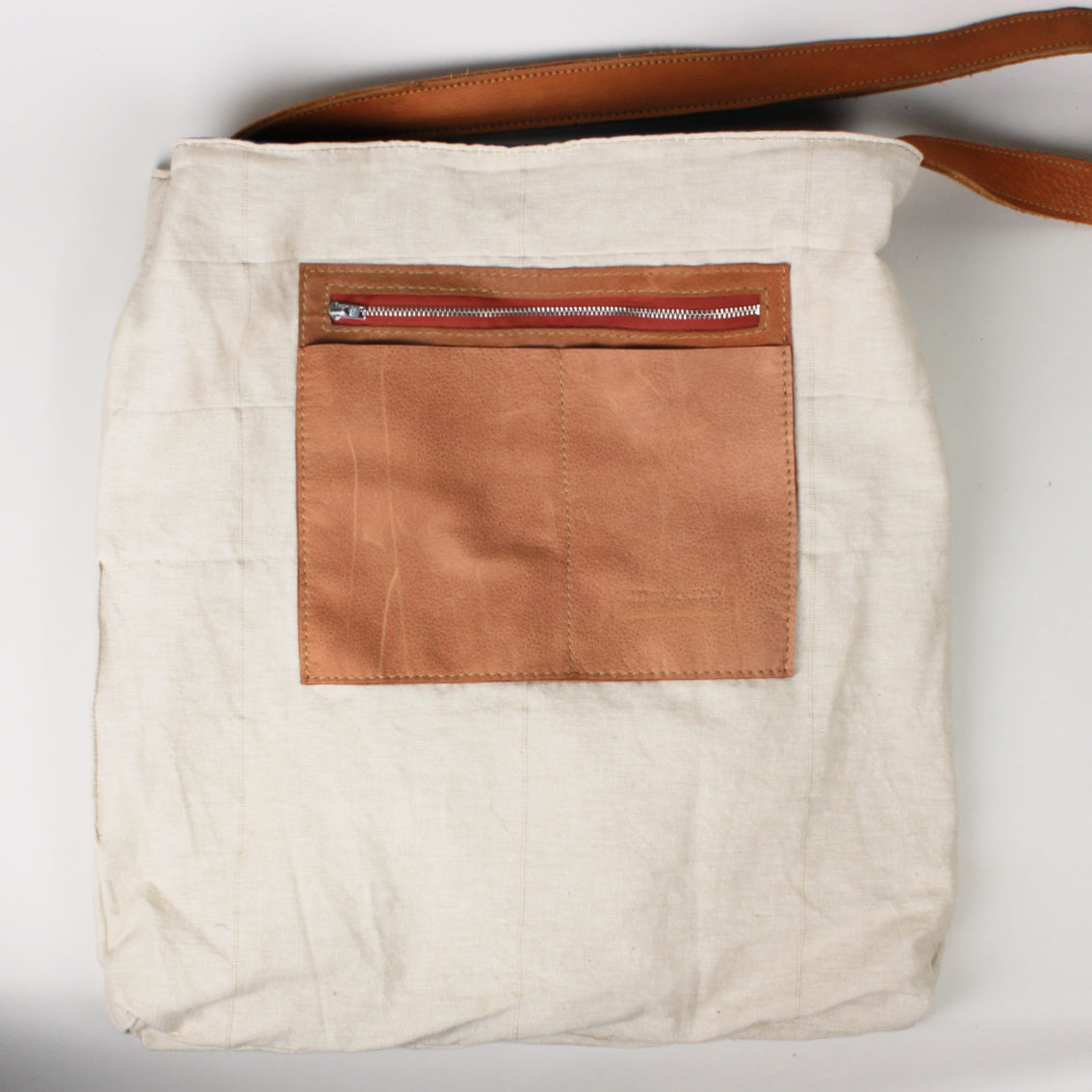Die Tasche ist aus Baumwollstoff, der Träger und die zwei Innentaschen sind aus Leder. Das Material ist upgecycelt und stammt von einem Ledersofa und aus Baumwollvorhängen.