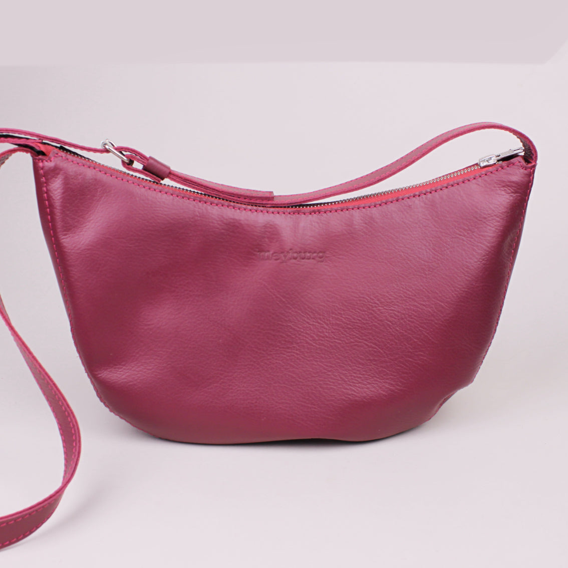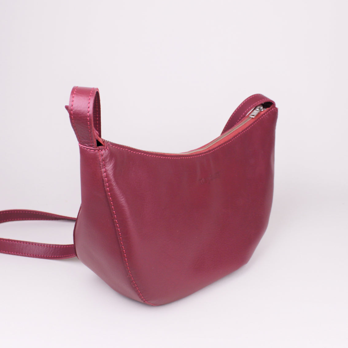 Gefütterte Tasche aus upcycling Leder in Halbmondform.